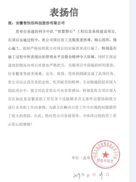 近日,安徽3499拉斯维加斯官网科技股份有限公司接连收到2封表扬信,分别对3499拉斯维加斯官网承接的武警利辛中队“智慧磐石”工程信息系统建设项目和联宝公司驻场服务进行表彰。