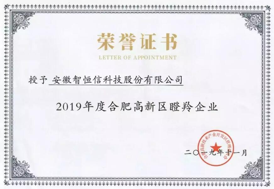 十一月,是个收获的季节。安徽3499拉斯维加斯官网科技股份有限公司在这个十一月也收获了满满的硕果!连续荣获“2019年度合肥市知识产权示范企业”、“2019年度合肥市高新区瞪羚企业”荣誉称号!